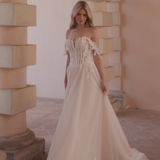 An elegant A-line gown with off-shoulder straps. The corset, crafted from semi-sheer shimmering fabric, is decorated with original floral lace. The multilayered skirt is finished with lace along the hemline;